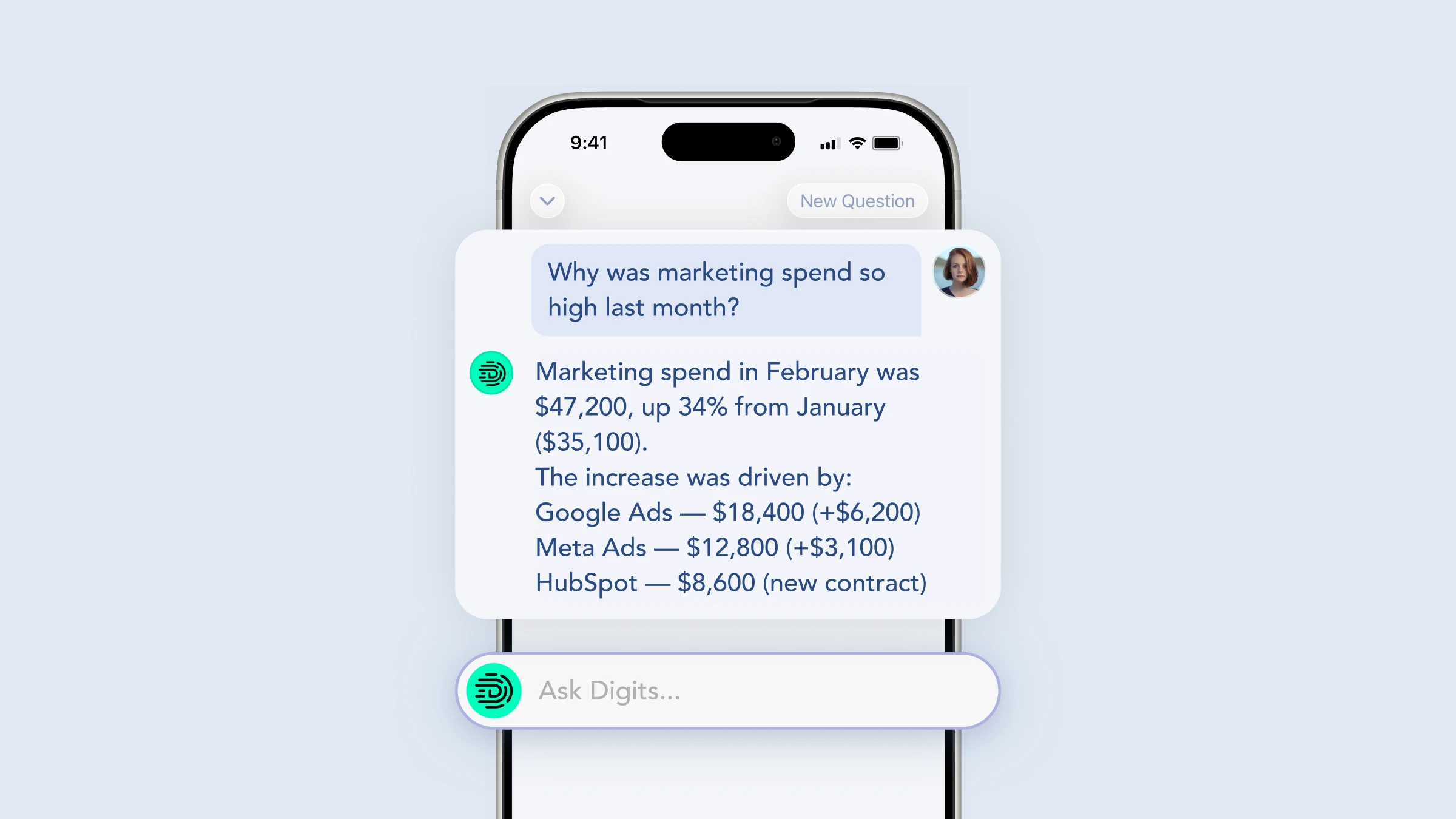 Ask Digits: "Why is my cash lower this month?" or "How much did I spend with this vendor last quarter?" Get accurate answers from your live financials. Ask follow up questions and Digits keeps the conversation going.